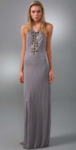 T-Bags V-neck Long Dress, $194 at shopbop.com, Young, Fabolous & Broke Hannah Long Dress, $273 at shopbop.com: This first dress is perfect for a pear-shaped, or bottom-heavy body, where the hips are somewhat wider than the shoulders. In order to make your hips look smaller, you want to make your shoulders and chest look a little broader--that's where the optical illusions come in. A skirt like this, that flows over the hips without hugging them, will highlight your hips without emphasizing them, the patterned waist-tie will draw the eye to your waist and make it look teensy, and the slightly loose top and wide neckline will make your shoulders look wider, balancing out the width of your hips. That gorgeous aqua hue is just a lovely bonus. This slim-lined, grey maxi dress would be really nice for boyish, or straight figures. You don't want to go all out with a really full skirt, because it will completely overwhelm your torso. You want to go with a dress that clings to the upper body, emphasizing whatever curves you have, and then flares into a gentle a-line skirt. This will make you hips look wider and curvier, and the high(ish) neckline will make your chest a little bigger. If you have a straight torso and a larger chest, you want to show a little skin at the neckline, or it will just make you look bustier. This grey maxi dress has a detachable bib necklace that's really fun and will immediately draw the eye to your waist.